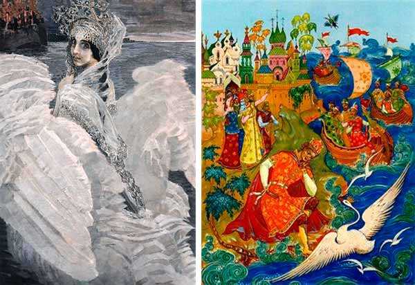 Слева: Михаил Врубель. Царевна Лебедь. Справа: А.Куркин. Иллюстрация к сказке о царе Салтане.