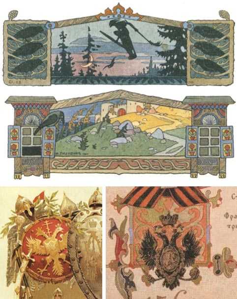 Вверху и по центру: Иван Билибин. Образы ворона и вороны. Заставки к русским народным сказкам “Василиса Прекрасная” и “Марья Моревна”. Внизу: Виктор Васнецов. Декоративное меню обеда и Святый Георгий Победоносец. Детали композиций.