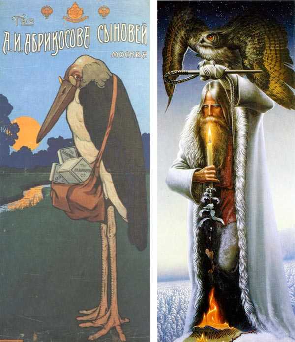 Слева: Ф. Вендиш. Товарищество А.И. Абрикосова и сыновей. Плакат. Справа: Константин Васильев. Человек с филином.