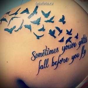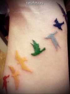 Татуировки в виде летящей стаи птиц стали очень популярными не только среди прекрасных девушек, но и среди сильной половины человечества. Тату с птицами говорит о волевом и принципиальном характере обладателя, а так же про преданность верность в любви, хотя это зависит от того, татуировку какой именно птицы вы пожелаете нанести.