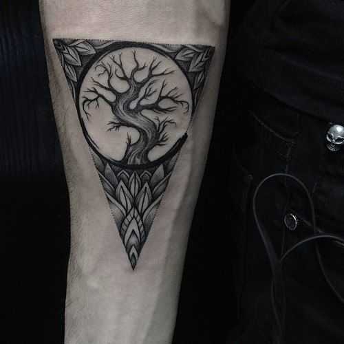 Вид татуировок может быть различным. Представляет интерес также и то, что значит треугольник, в котором изображено дерево. Это простой рисунок, скрывающий глубокий смысл. В нём сочетаются два важных символа, поэтому человек, наносящий такое тату, чтобы самовыражаться, хочет указать на оба значения.