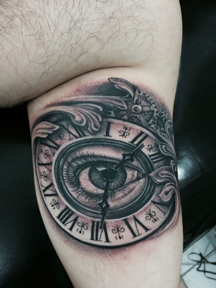 Часы, изображенные в стиле стимпанк или биомеханика можно комбинировать с изображениями винтиков и других механических частей. Интересный способ сделать татуировку более сложной – изобразить прозрачный циферблат, показывающий механизм внутри.