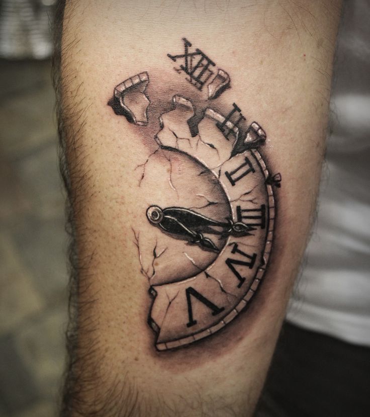 Татуировка в виде часов олицетворяет понимание конечной природы существования. Однако тату со сломанными часами символизирует равнодушие владельца к этому аспекту жизни. Это означает, что владелец верит в то, что нужно жить моментом, и ценит опыт. Более того, это отбрасывает важность подсчета времени на второй план.
