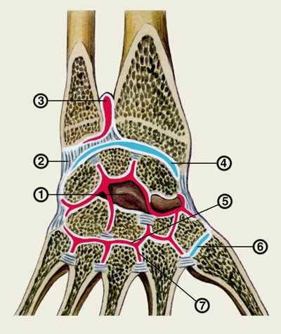 Суставы запястья: 1 — межзапястный сустав; 2 — суставной диск; 3 — нижний лучелоктевой сустав; 4 — лучезапястный сустав; 5,6 — запястно-пястные суставы; 7 — межпястный сустав