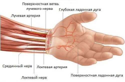 Пройдя каналы, локтевая и лучевая артерии оказываются на ладонной и тыльной поверхности кисти, где аностомозируют между собой с образованием глубоких и поверхностных сосудистых дуг. От них к пальцам берут начало более мелкие артерии. Такой тип кровоснабжения через артериальные дуги служит гарантией функциональности кисти при повреждении какой-либо артерии.