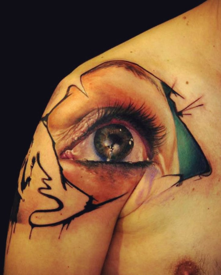На изображении выше художник-татуировщик также проделал фантастическую работу, сделав татуировку глаза очень реалистичной благодаря эффективному использованию цветных чернил.