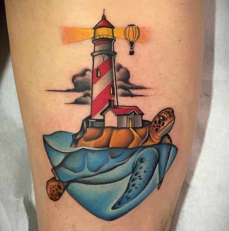 Тату маяк и черепаха в виде корабля