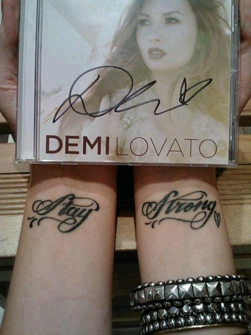 Одна из самых значимых татуировок Деми – надпись «Stay Strong» на запястье, которую она сделала в 2011 году. чернила очень важны для нее, поскольку они напоминают ей быть позитивной. Она сделала эту татуировку вскоре после того, как вышла из реабилитационного центра из-за проблем с порезами и булимией, и нанесла ее на запястье, где она резала себя. Она говорит, что татуировка для нее символична, и она хотела скрыть свои синяки и заменить их чем-то постоянным.