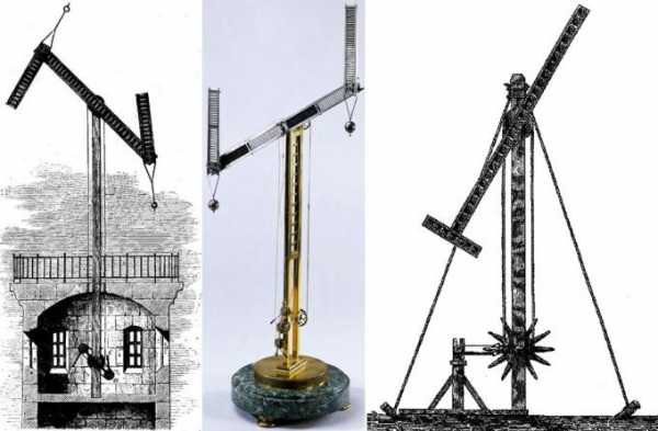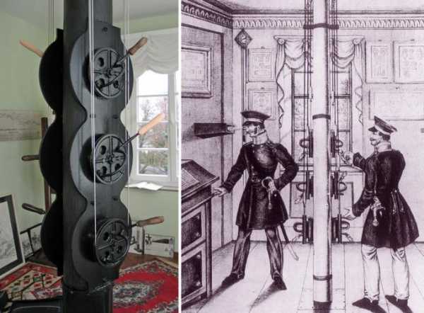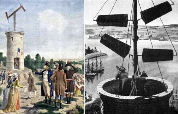 Слева: Клод Шапп демонстрирует французам свое изобретение. Справа: одна из разновидностей оптичческого телеграфа в морском порту.