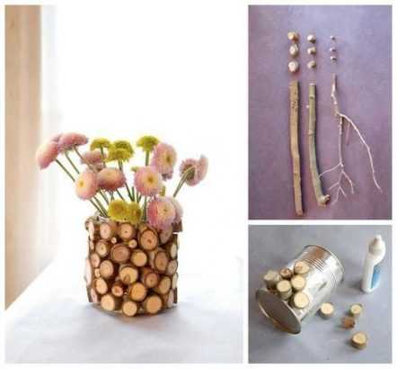 Еще одна творческая работа для начинающих столяров, которая будет подвластна школьникам 11 — 12 лет, — это вазочка из деревянных спилов и металлической банки. Такую поделку, изготовленную своими руками, можно подарить своей маме, бабушке или подружке. Внимательно посмотрите на фото и приступайте к изготовлению данного интересного изделия.