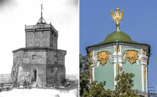 Телеграфная надстройка на башне Гедемина в Вильно и башенка центральной российской станции оптического телеграфа на Зимнем дворце. После ликвидации станции на ней вместо семафора установили скульптурное изображение государственного герба.