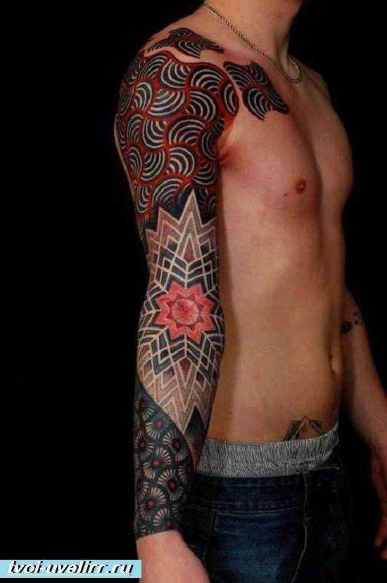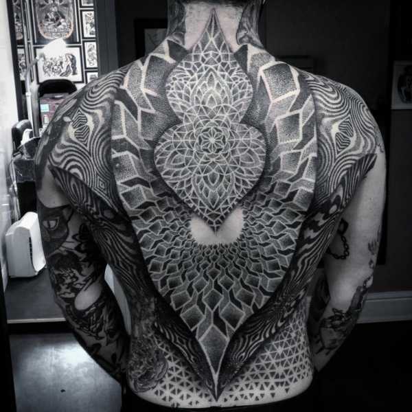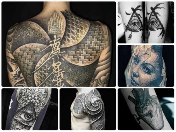 Татуировка в стиле дотворк. Изображения на теле, сделанные в стиле дотворк, как правило, довольно сложные и набиваются в форме геометрических или абстрактных фигур. Рисунки создаются благодаря игре цвета, точки наносятся с учетом: