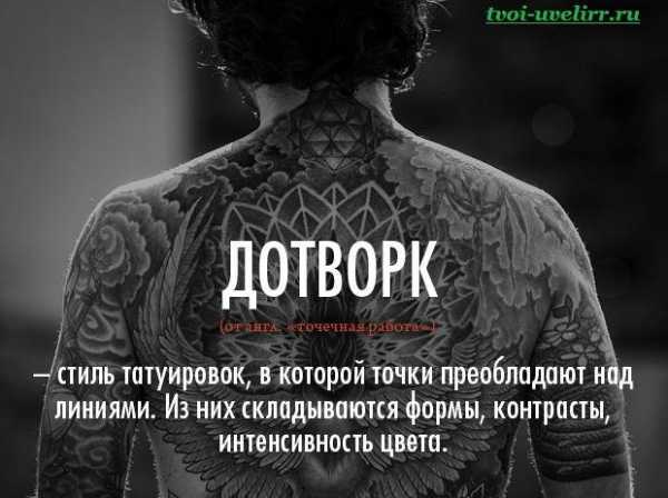 Дотворк — это стиль татуировок, название которого перешло от английского слова dotwork, состоящего из двух частей: dot — “точка” и work, что переводится как “работа”. То есть, особенность этого стиля заключается в использовании большого количества точек, как основы всего рисунка. Расстояние между точками должно быть строго соблюдено, так как от этого зависит, насколько темным будет изображение.