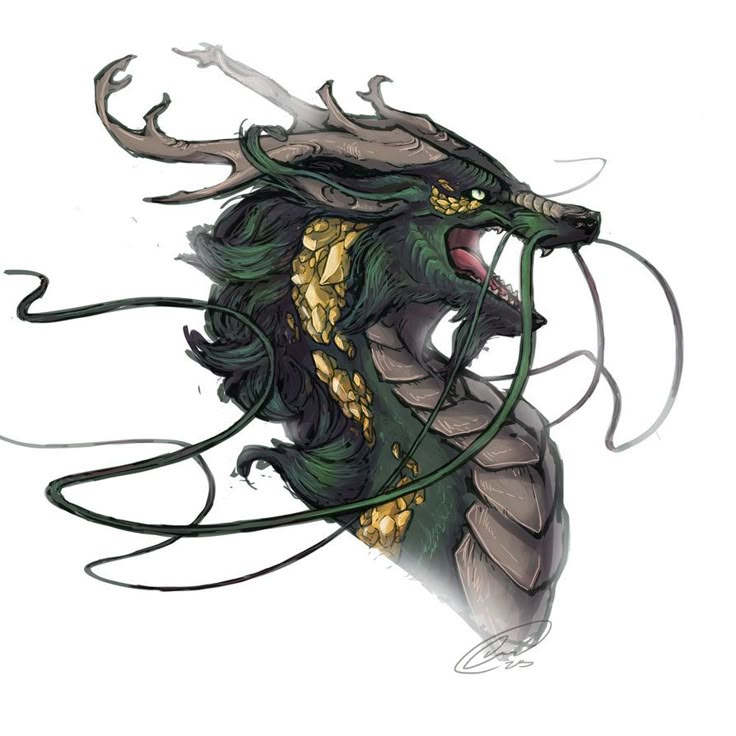 У дракона рога оленя, голова верблюда, глаза кролика, уши быка, шея змеи, чешуя карпа, когти орла, лапы тигра