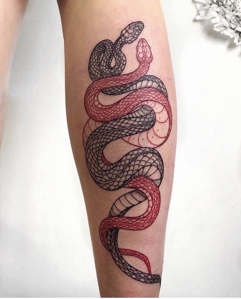 Вытянутые контуры холоднокровного эффектно смотрятся на ногах, удлиняя их. Змея на ноге – тату преимущественно женское.