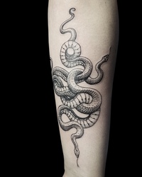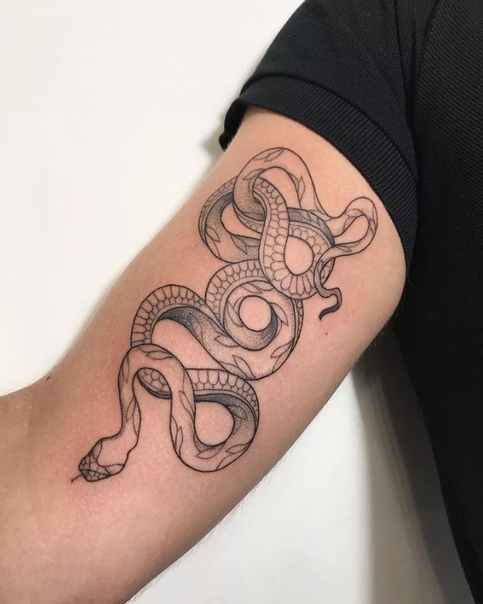 Одно из наиболее популярных изображений в тату. Несмотря на заложенные в образе змеи чисто женские свойства (хитрость, гибкость, изворотливость), татуировки с подобным сюжетом предпочитают мужчины. Девушки же чаще видят в змеиных тату либо агрессию и соблазнение, либо стервозность и внутренний яд.