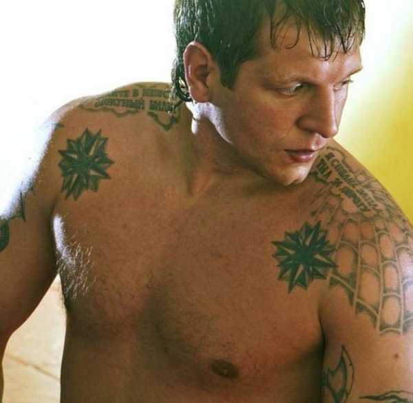 Первое, что сразу же бросается в глаза — это характерные воровские звезды. Причем нанесены они не по-дилетантски, а в «правильных местах». На теле Емельяненко четыре звезды — две под коленями и две чуть ниже плеч. Первые на воровском языке обозначают «меня не поставить на колени». Вторые также наколоты по всем воровским правилам — не на плечах, а чуть пониже. (Сейчас у Александра эти наколки перебиты какими-то облаками, спрятал типа)Потому что звезды на плечах — это уже погоны. И ни один уважающий себя урка не станет колоть в этом месте «ментовский символ». Зато вместо погон у спортсмена на плечах другой четкий символ — воровская паутина, символизирующая тюремную решетку.