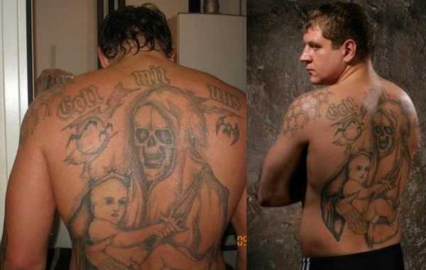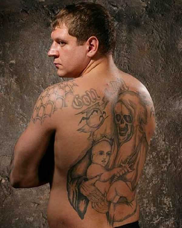 На спине бойца можно видеть большое количество различных тату. Это и младенец в короне, и Божья Матерь. Сам Емельяненко не желает комментировать их значение. Но в любом случае одно можно сказать точно, что наколки набиты в традиционном уголовном стиле.