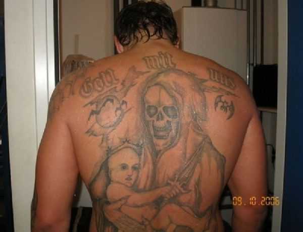 Не знаю зачем он их набил, на спине не просто рисунок, а воровская наколка со значением западло иметь семью и детей