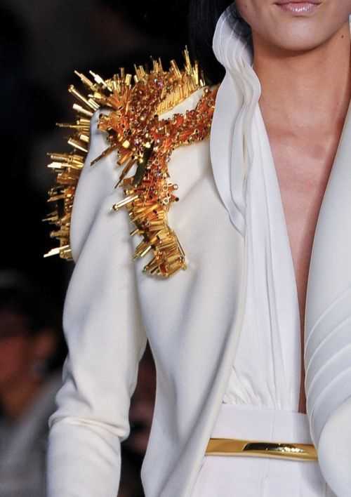 Наиболее ярким появлением современных украшений для плеч можно считать модные коллекции весны 2010 года от Balmain и Jean Paul Gaultier.
