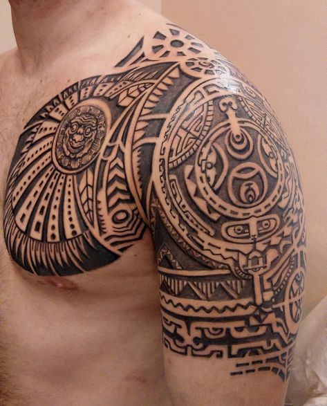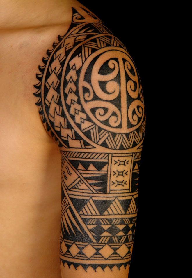 Полинезийский стиль легко узнаваем ввиду своей уникальности. Причудливый орнамент из геометрических фигур и зигзагов напоминает искусную резьбу по дереву, которой, кстати, также славились древние полинезийцы. Такое украшение имели право носить только мужчины, каждая татуировка несла священный смысл, влияющий на судьбу носителя, а процесс ее нанесения был долгим и болезненным. Так тату в виде маски тики наносились на тела воинов и охотников, изображение акулы украшало рыбаков, солнце символизировало жизнь и являлось источником неисчерпаемой энергии.