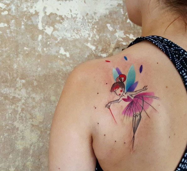 Эта татуировка феи включает в себя цвета, которые выделяют ее из толпы и отражают тона природы.