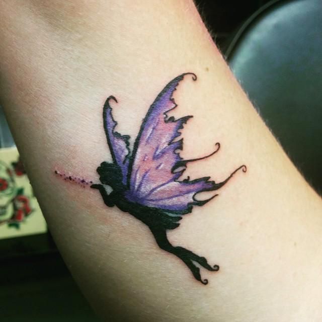 Этот рисунок, особенно популярный в последние пару лет, включает в себя фею с крыльями бабочки. У этой идеи есть разные варианты — например, красочный набор крыльев бабочки с фигурой феи, похожей на балерину, только очертания.