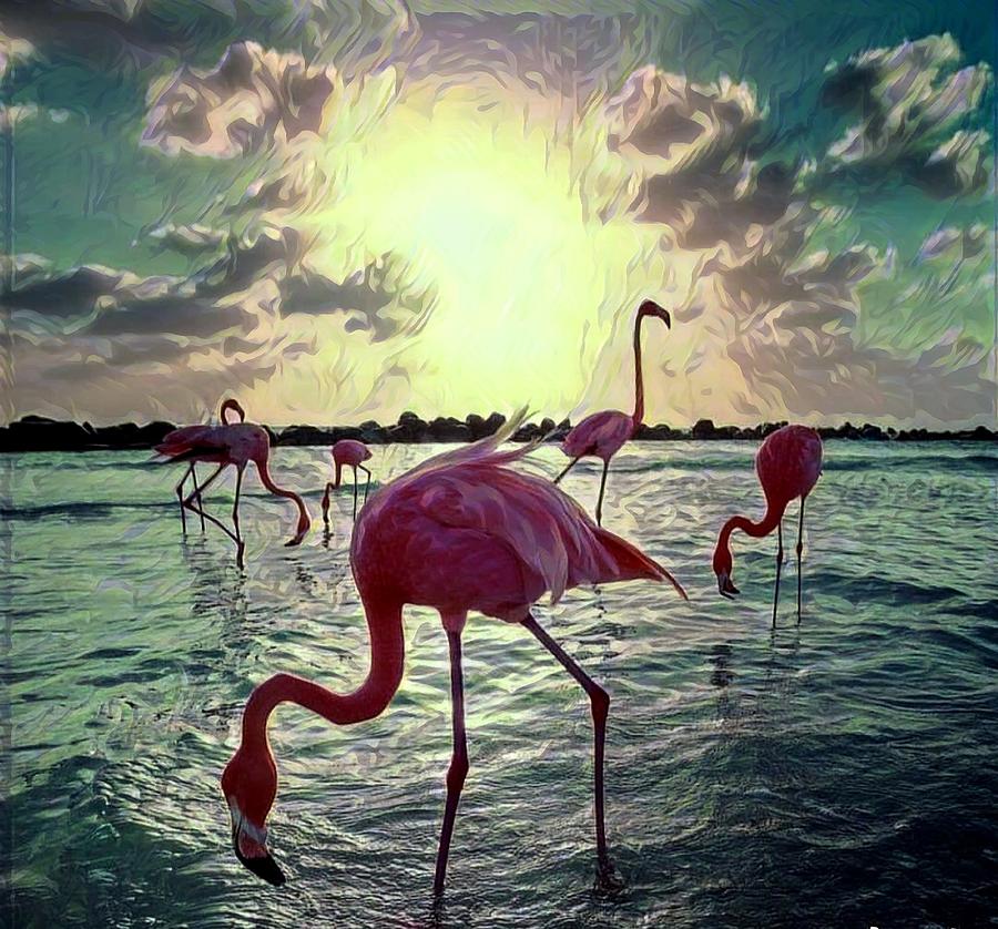 Цвет птицы не обязательно должен быть розовым. Ее выразительный силуэт узнаваем и без цвета. Поэтому замена цвета приветствуется и может быть использована, как ключ к неординарности работы. Фламинго любим многими художниками. Запаситесь терпением и вы сможете отыскать изображение, которое вдохновит вас на создание индивидуальной работы.