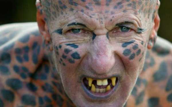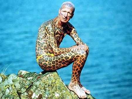 Tom Leppard (Человек-леопард) был занесен в книгу Гиннеса, как самый татуированный человек в мире. И хотя сегодня его рекорд уже побит, Том не унывает, продолжает “видеть” в себе леопарда и ведет отшельническую жизнь на отдаленном остров Скай в Шотландии. Причем живет он в маленькой хижине, а из одежды носит лишь набедренную повязку. Том уже в пожилом возрасте и раз в неделю делает вылазки на байдарке в цивилизованный мир, чтобы забрать пенсию и купить впрок продуктов.