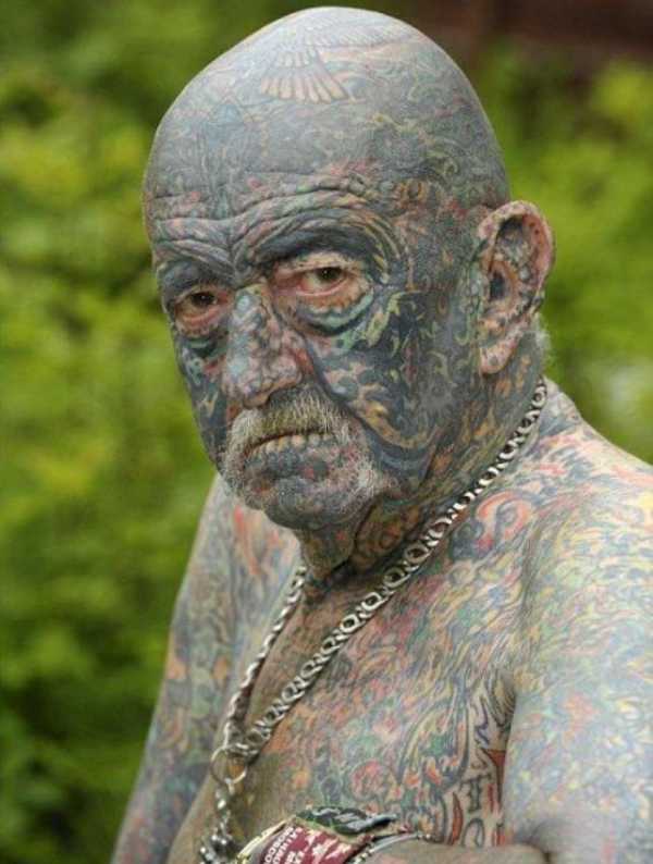 Самый татуированный дедуля во всей Великобритании. За последние полсотни лет он только то и делает, что регулярно покрывает свое тело самыми разнообразными наколками.
