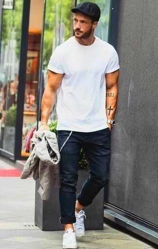 Белые низкие кеды из плотной ткани СохранитьУдалитьСерый бомбер и кепка — хорошая формула для создания приятного и практичного образа. Хочешь добавить в этот ансамбль нотку классики? Тогда в качестве дополнения к этому луку, выбирай белые низкие кеды из плотной ткани.