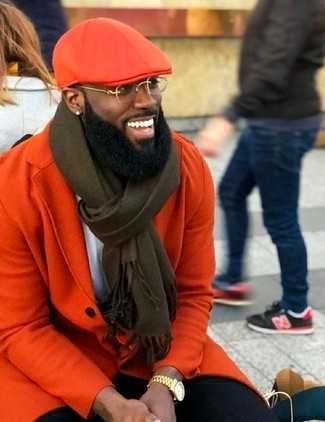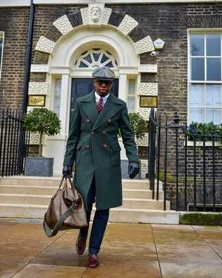 Если в одежде ты ценишь комфорт и практичность, оливковое длинное пальто и кепка — замечательный выбор для расслабленного мужского лука на каждый день. Хочешь добавить сюда толику строгости? Тогда в качестве дополнения к этому луку, стоит обратить внимание на темно-коричневые кожаные лоферы с кисточками.