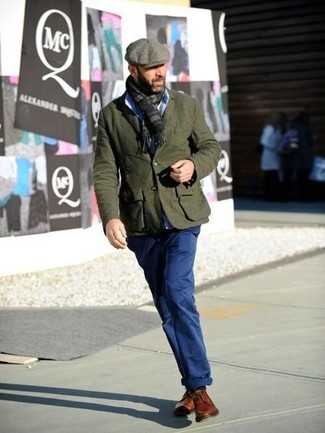 Темно-синие джинсы СохранитьУдалитьОливковый шерстяной жилет в паре с кепкой поможет составить стильный мужской образ.