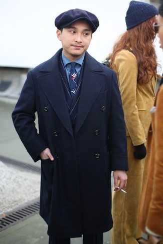 Темно-синий двубортный пиджак в вертикальную полоску СохранитьУдалитьЧерное длинное пальто и кепка — великолепная формула для создания приятного и незамысловатого лука.