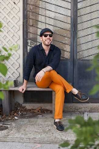 Черные кожаные топсайдеры СохранитьУдалитьЕсли у тебя наметился сумасшедший день, сочетание черной рубашки с длинным рукавом и кепки поможет создать комфортный ансамбль в стиле casual. Хочешь добавить сюда немного строгости? Тогда в качестве дополнения к этому луку, стоит обратить внимание на черные кожаные топсайдеры.