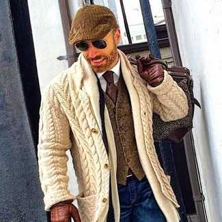 Табачные кожаные ботинки дезерты СохранитьУдалитьРазноцветный кардиган с отложным воротником и кепка позволят создать несложный и функциональный лук для выходного в парке или вечера в пабе с друзьями. Немного строгости и мужественности образу добавит пара табачных кожаных ботинок дезертов.