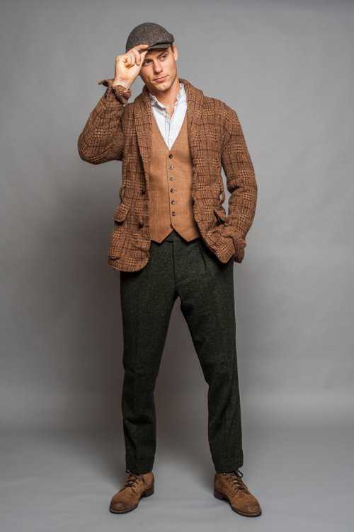 Конечно, головной убор должен соответствовать и гармонировать всему остальному наряду. Если вы выбрали кепку из твида, не стоит носить ее с тонким формальным костюмом. Материал остальной одежды должен быть так же груб, шероховат и спортивен, как и сама кепка (здесь термин “спортивный стиль” используется в широком смысле). На фото ниже – пример сочетания повседневной одежды с твидовой кепкой узкого кроя.