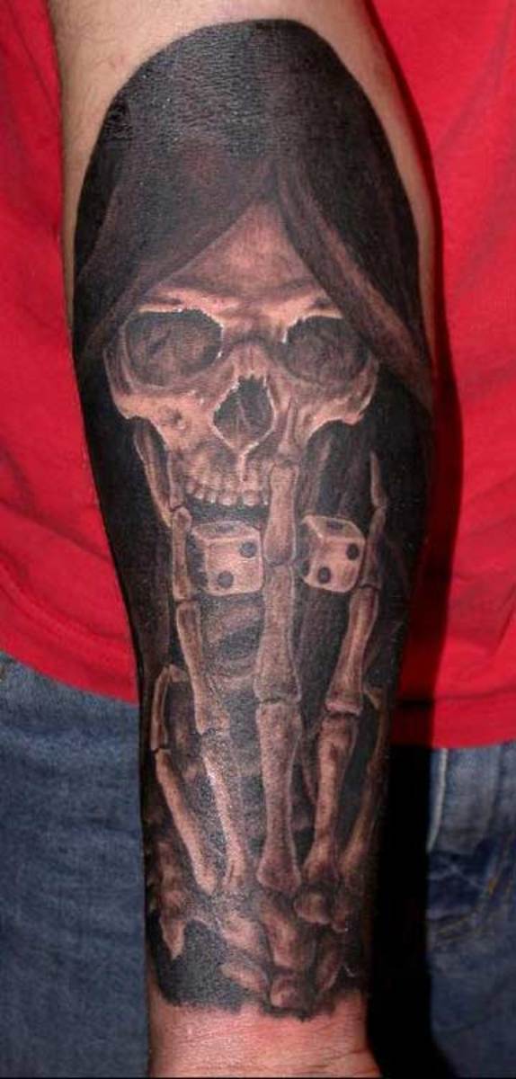 Татуировка «смерть» пользуется популярностью у людей бесстрашных и отчаянных. Нанося на свое тело подобный символ, они будто подчеркивают, что чувство страха им чуждо. Изображение смерти с игральными картами символизирует игру на выживание и огромный риск.