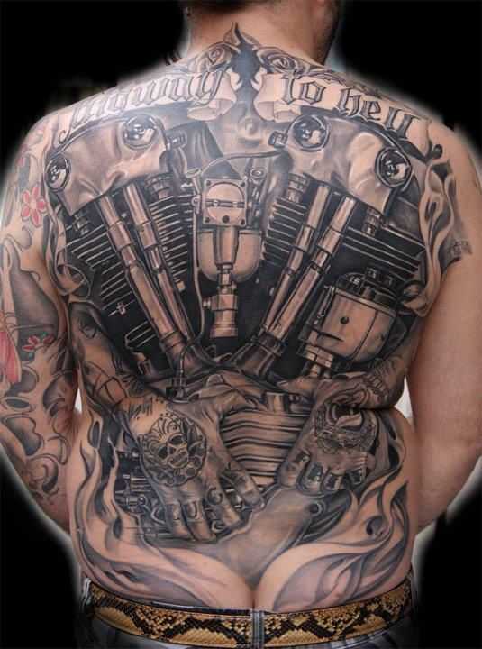 Harley-Davidson — одна из самых популярных тем тату. Самый огромный байк-клуб составляют поклонники именно этой марки. Сейчас, байкерами считаются не только те, кто ездят на классических чоперах, но и мотоциклисты на спортивных байках. Но все равно, Harley-Davidson является эталоном байка и поэтому, часто люди набивают татуировки с названием именно этой марки или с двигателем В-Твин. Двигатель давно стал символов байков Харли.