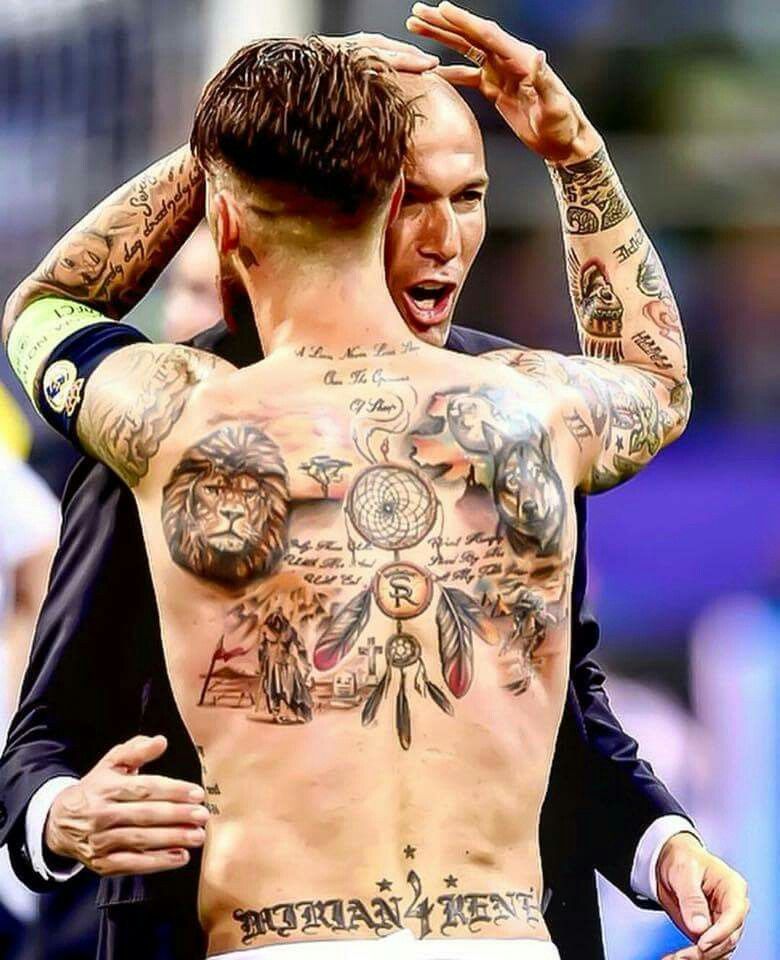 Эта превосходная татуировка — самая привлекательная из всех, что есть у Рамоса на спине. К волку присоединяются лев в саванне, страж и ловец снов, которые вместе охватывают почти всю спину футболиста.