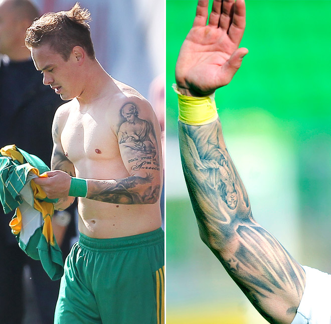 Ещё один наш соотечественник, защитник “Спартака”, интересен тем, что делает татуировку каждый раз, когда приходит в новую команду. Наиболее заметные из них –это Дева Мария, ангел, Андрей Первозванный, а также собственные инициалы на ноге.