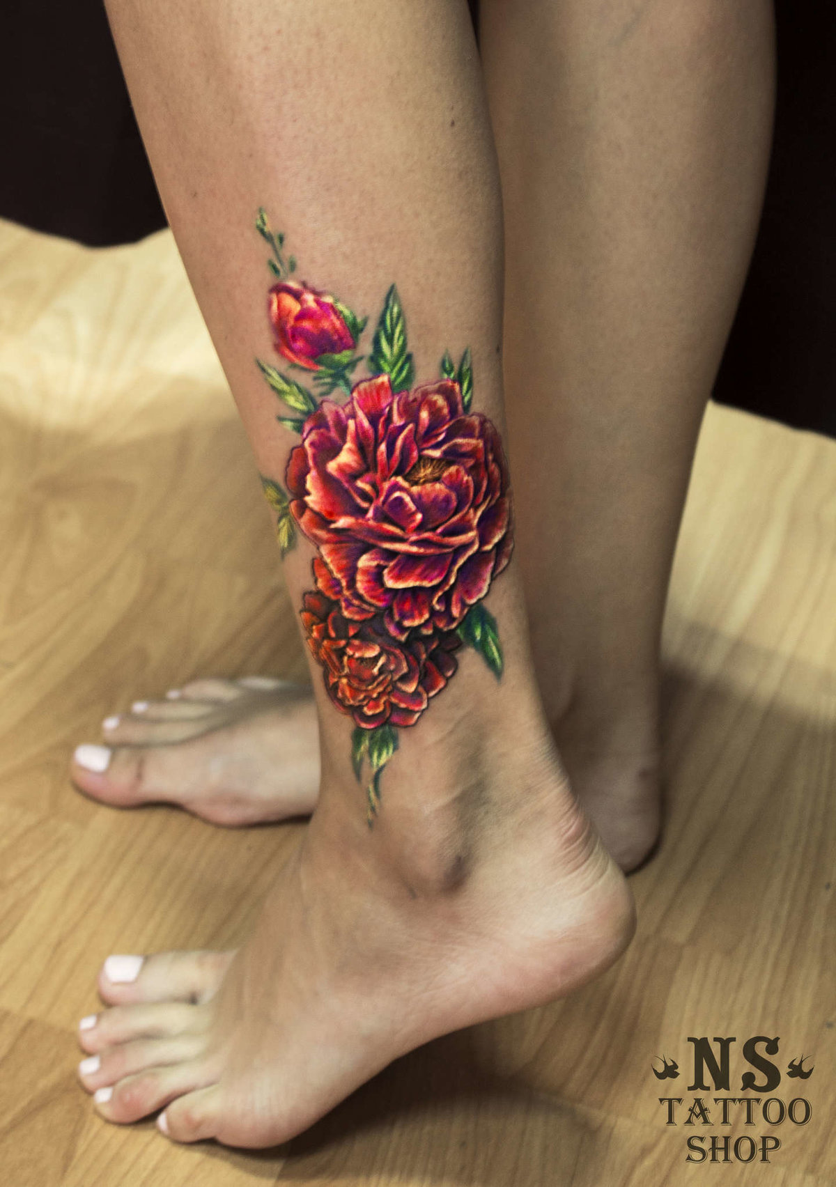 Постоянно популярны эскизы в виде крылатых фраз, мотивирующих изречений, строе из песен. Тату с надписями делают на современных европейских языках, санскрите, латыни. Для их нанесения используют витиеватые шрифты, сочетающиеся с цветами и различными символами. Не менее распространены виды тату на ноге цветочной тематики:- роза означает страсть темперамент;