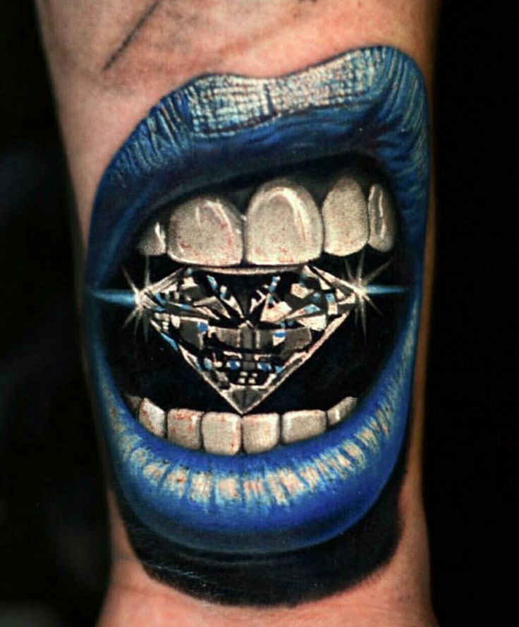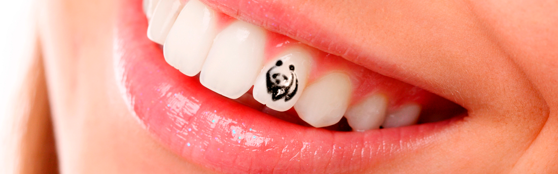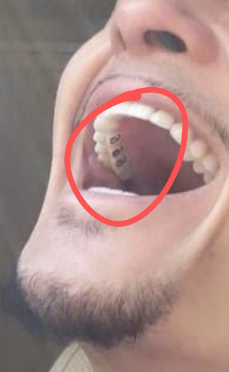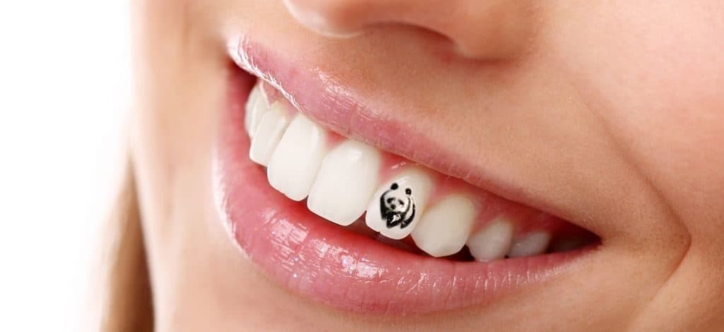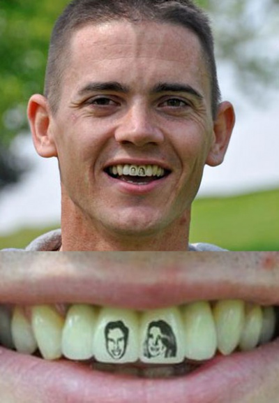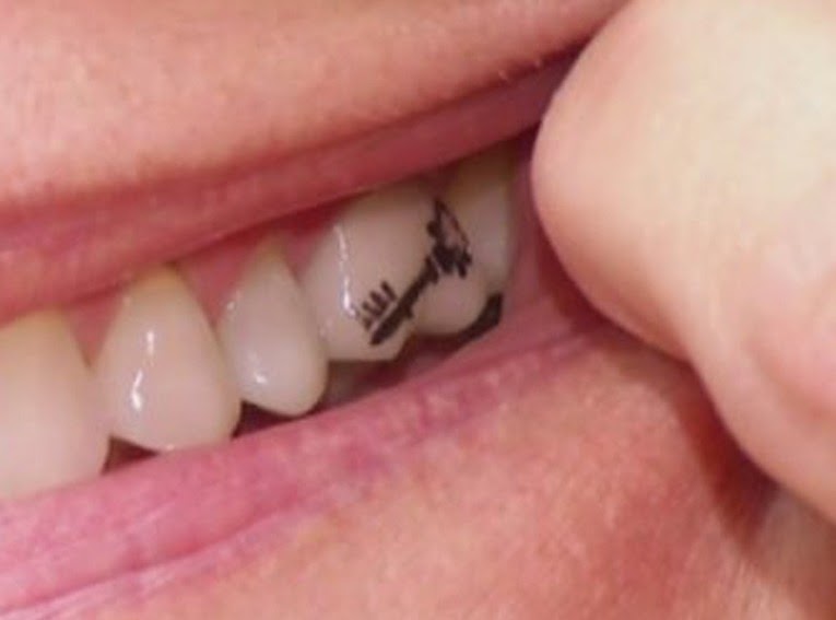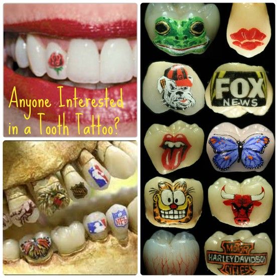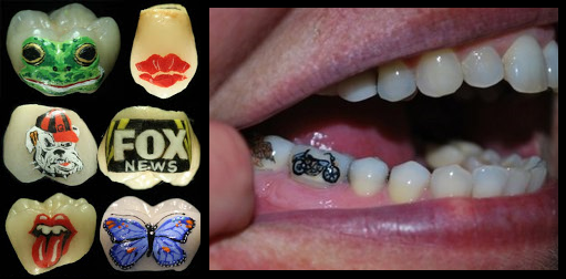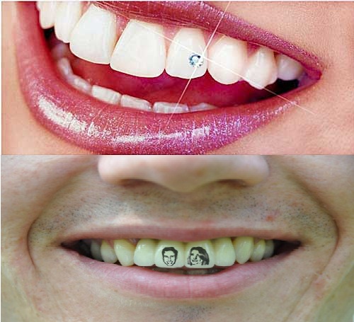 Особую нишу занимают наколки на зубах. Наносятся они на один или на два резца. При этом можно набивать рисунок, как на натуральные зубы, так и на коронки. В первом случае тату мастера пользуются краской, безопасной для эмали.