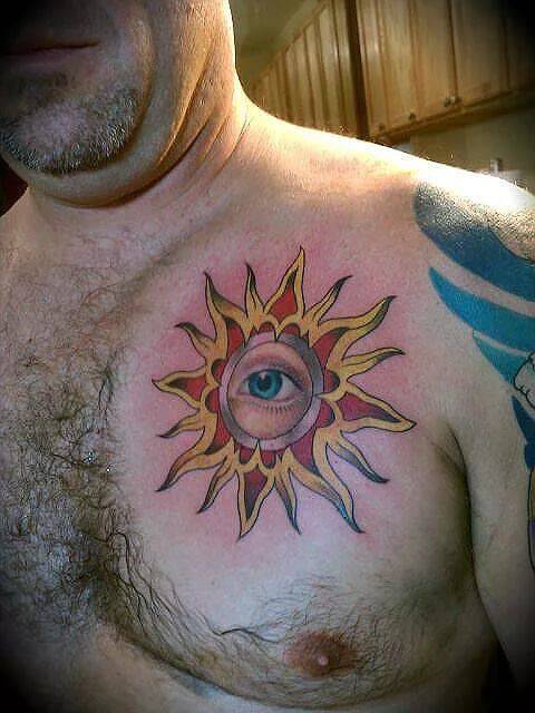 Тату на груди парня – солнце и глаз