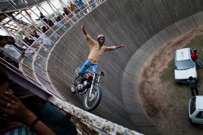 Сумасшедший смельчак-байкер катается на вертолете и стоит на сиденье, изолированном на белом фоне