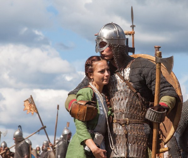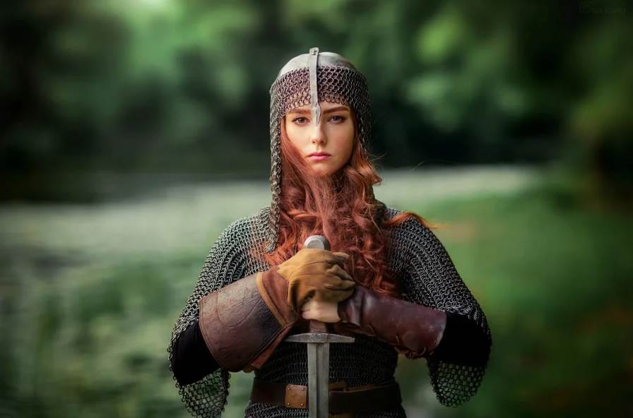 Красивая рыжеволосая девушка в образе древних воинов на фоне природы.