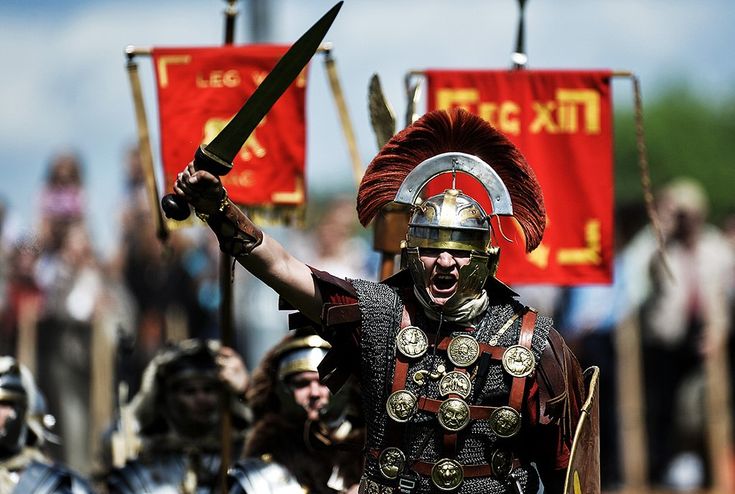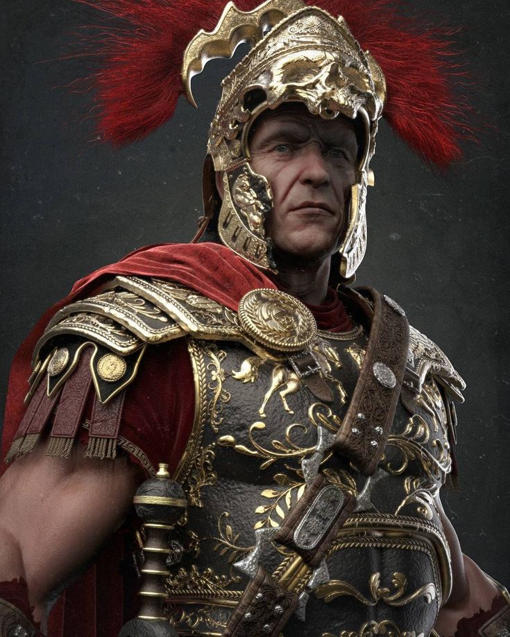 Красное будущее, римский воин в шлеме из перьев и конской гриве. на ней чешуя красного дракона, фантазийная поза