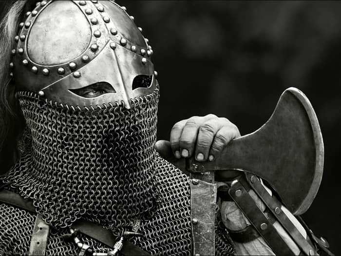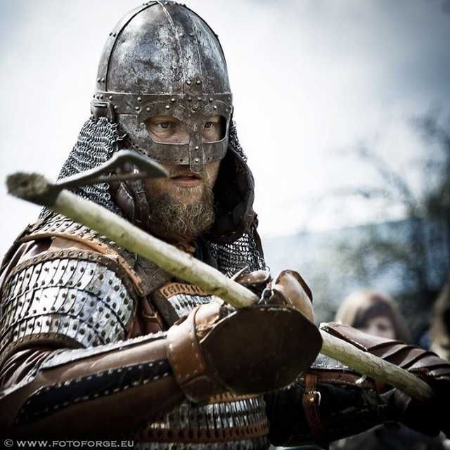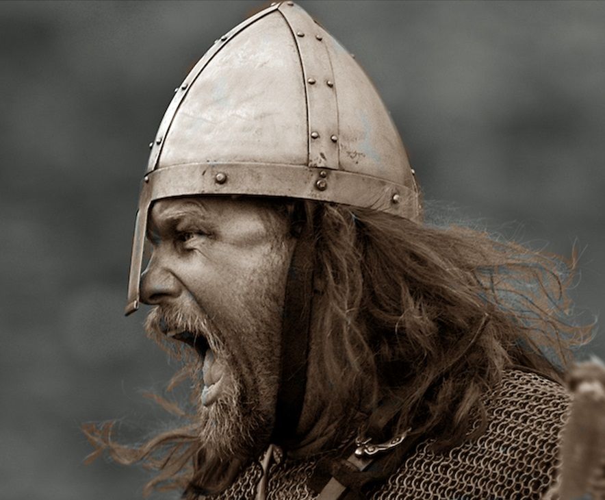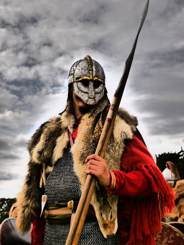 Серьезный викинг в традиционной одежде воина позирует на темном фоне.