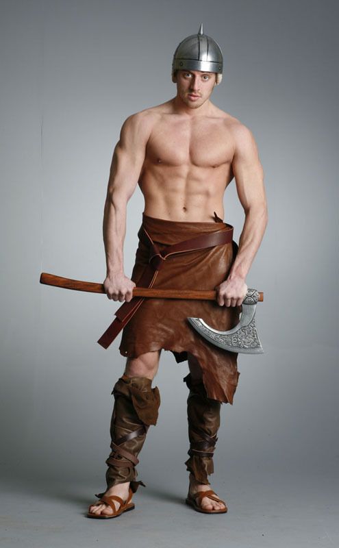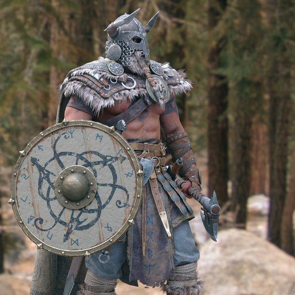 Бородатый чернокожий варвар с мехом и бритой головой, держащий топор