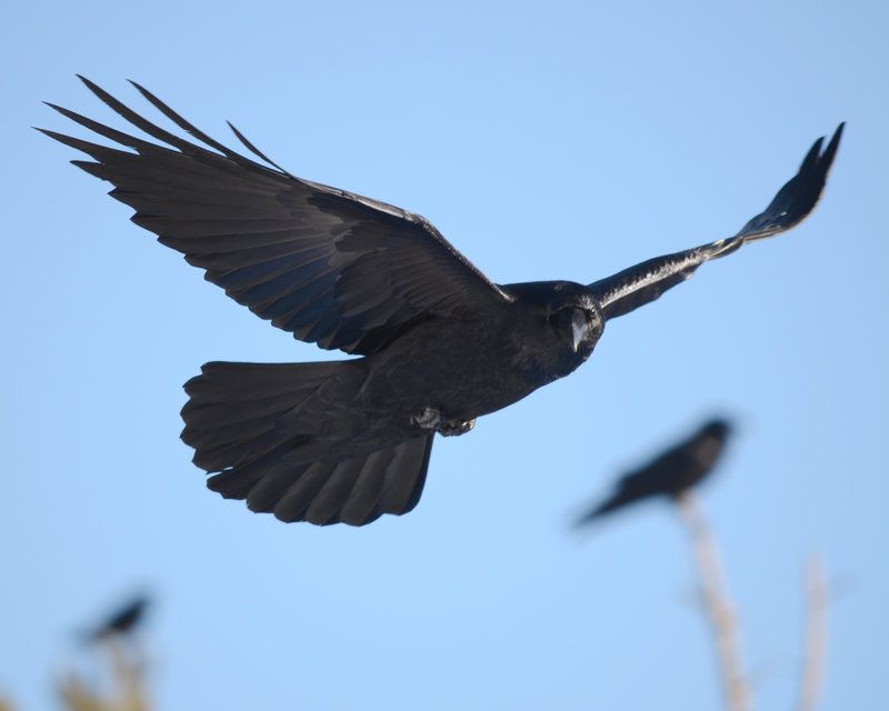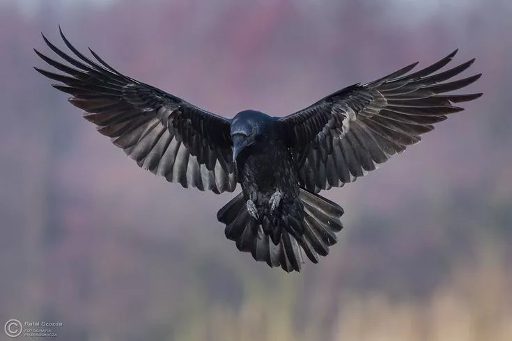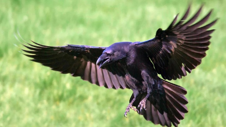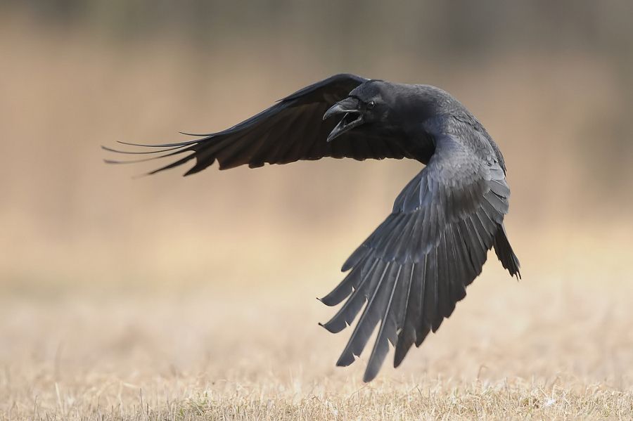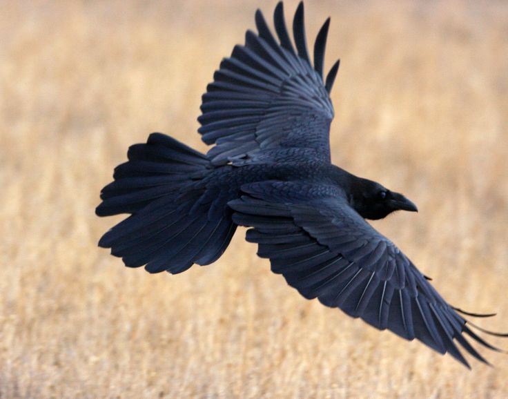 Фотография черной вороны, летящей с расправленными крыльями